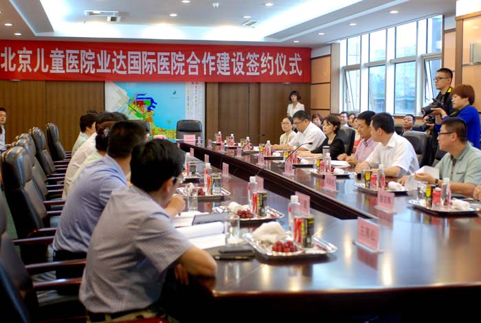 2014年6月20日上午,北京儿童医院业达国际医院合作建设签约仪式在烟台经济技术开发区举行。烟台市委常委、开发区工委书记、管委主任王曰义,烟台市卫生局局长李翠玲,烟台开发区卫生局副局长、区医院院长鞠建伟以及我院倪鑫院长、沈颖书记、北京儿童医院集团秘书长马庚等双方领导出席了会议。