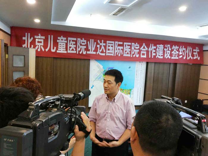 北京儿童医院院长倪鑫在签约现场接受当地媒体采访