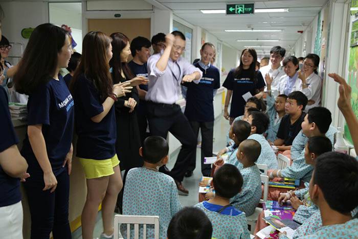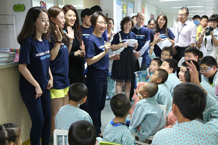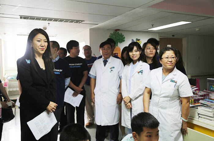 6月26日下午,在摩根士丹利亚太区联席CEO、董事总经理孙玮女士的带领下,摩根士丹利的志愿者们带着对孩子的关爱,来到儿童医院心脏内科病房看望住院患儿。他们精心准备了儿童歌曲、各种谜语、成语猜词,并且为孩子们带来了图书和彩笔。志愿者与住院的孩子们一起做游戏、唱歌,孩子们高兴地参与到活动中。