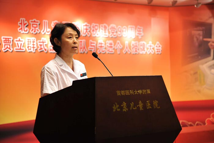 沈颖书记代表院党委发表讲话。她说,开展“创建贾立群式品牌团队、争做贾立群式先进个人”活动,加强了我院医务人员的医德医风建设,使社会主义核心价值观更加深入到职工心中。希望每名党员都以贾立群同志为榜样,全心全意为患者着想,在全院涌现出更多的贾立群式好党员。