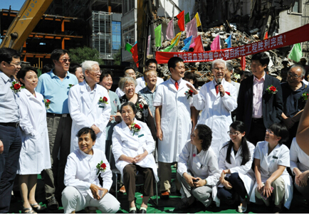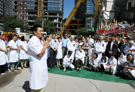 情牵三代人、历经十一载,备受瞩目的北京儿童医院血液肿瘤中心项目今天又迈出了历史性的一步。2014年9月3日,秋高气爽,伴随着“轰隆隆”一声巨响,位于北京儿童医院东北角的“月坛南街甲2号楼”破土拆迁。这一锹,撬动的不仅是于2003年立项、2007年奠基、却因拆迁问题不得不停滞数年的北京儿童医院血液肿瘤中心项目,更撬动了现场老中青三代“儿医人”热切期盼的心。北京儿童医院胡亚美院士、张金哲院士、名誉院长李仲智等往届院领导代表、倪鑫院长等部分现任院领导,以及老专家代表和医院其他相关人员等齐聚拆迁楼前,共同用微笑和泪水见证了这一项目拆迁工程胜利完成的历史瞬间。