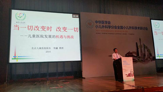 2014 年9 月11 日至13日,我院倪鑫院长带领外科专家一行赴广州参加了中华医学会小儿外科学分会全国小儿外科学术研讨会,并受邀于12日在大会上做题为《当一切改变时 改变一切——儿童医院发展的机遇与挑战》主题演讲和关于《儿童头颈外科的建立》论文交流。