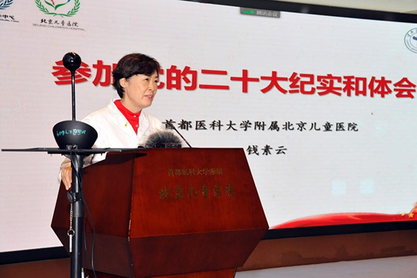“我们都是劳动者、新时代的奋斗者,每个人都尽自己的努力做好本职工作,多为别人着想,我们的国家一定会更和谐、人民更幸福、儿童更健康”“要在以习近平同志为核心的党中央领导下,在日常工作中体现党性、先进性,传递正能量,推动健康中国建设”。钱素云同志通过她的切身感受诠释着永远跟党走的决心和信念,与会人员深受感动。
