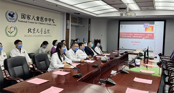 2022年11月18日,发热门诊临时党支部召开“深学细悟二十大精神,疫情防控党员先行”暨北京儿童医院北楼开楼2周年主题党日活动。院党委书记张国君,院党委副书记、院长倪鑫,党委专职副书记、纪委书记张海鸥,副院长葛文彤,工会主席王爱华和相关科室领导以及发热门诊52名医护等工作人员以线上线下结合方式参加活动。发热门诊临时党支部书记郭凌云主持本次党日活动。
