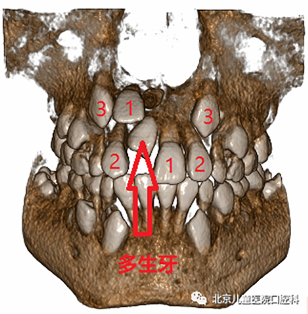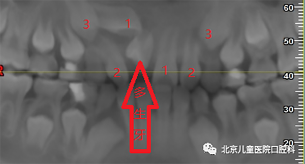 多生牙可发生在牙弓任何位置,多见于上颌前牙区,通常会占用正常牙齿在牙列中的位置,破坏正常的牙弓形态,同时,由于不具备正常牙齿的外形而缺少与正常牙齿的邻接,容易造成食物嵌塞和滞留,导致牙龈组织发炎甚至引起龋齿的发生。更有甚者,占用了正常恒牙萌出的空间,挡了正常恒牙的“路”,使得正常恒牙无法顺利萌出。