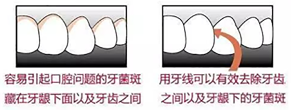 (4)将牙线贴紧牙颈部牙面并包绕牙面呈U型,使牙线与牙面接触面积较大,然后上下牵动,刮除邻面菌斑及软垢。每一个牙面要上下剔刮4~6次,直至牙面清洁为止。再以上述方法进行另一牙面的清洁。将牙线从咬合面方向取出。