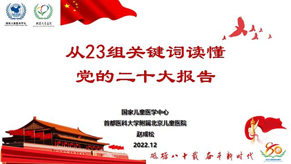 为深入学习贯彻党的二十大精神,使全体党员和积极分子能够深刻理解、准确把握党的二十大精神的精神实质和丰富内涵,12月28日下午,北京儿童医院感染学科党支部联合病理学科党支部、安保党支部组织学习二十大精神,会议邀请副院长赵成松作了“从23组关键词读懂党的二十大报告”的报告。会议由感染学科党支部刘钢书记主持,三个支部的全体党员、预备党员和入党积极分子以线上会议形式积极参加。