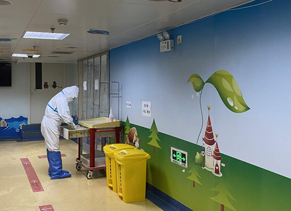 由于需要单间隔离,爸爸发烧需要到成人医院就诊,家里只有妈妈来进行看护。这种情况下,我们马上上报院领导进行协调,紧急调配两张单人床放在一个病室进行隔离留观。为防止交叉感染,将两张床以最大间距进行分开放置,并定时开窗通风,这样即保证了妈妈能够照顾两个宝宝,又能避免交叉感染的风险。