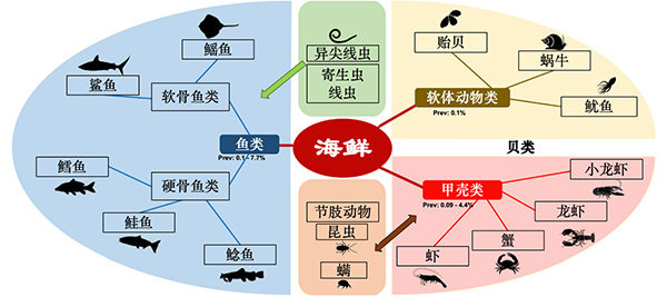 图1可食用海产品可大致分为脊椎动物(鱼类)和无脊椎动物(贝类)。食用鱼类主要分为软骨鱼和硬骨鱼,贝类则包括软体动物类和甲壳类。昆虫和螨虫(棕色箭头)等节肢动物可能含有与甲壳类交叉反应性的过敏原。异尖线虫等线虫常寄生于食用鱼(绿色箭头),但它们与甲壳类动物也有共同的过敏原。(图源自Davis CM, Gupta RS, Aktas ON, Diaz V, Kamath SD, Lopata AL. Clinical Management of Seafood Allergy. J Allergy Clin Immunol Pract. 2020;8(1):37-44. DOI: 10.1016/j.jaip.2019.10.019.)