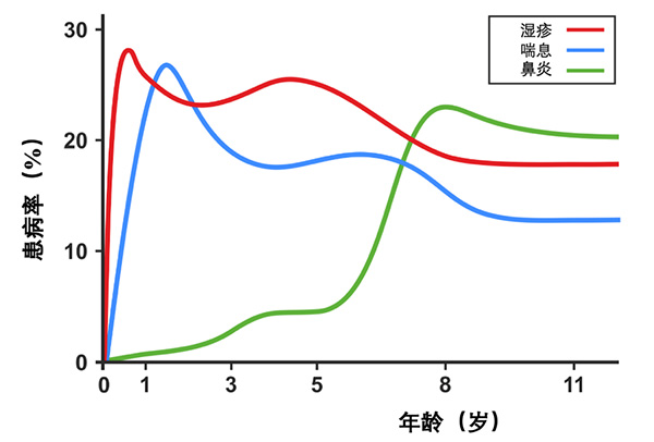 图1不同年龄儿童过敏性疾病患病率(图源于Belgrave DC, Granell R, Simpson A, et al.)