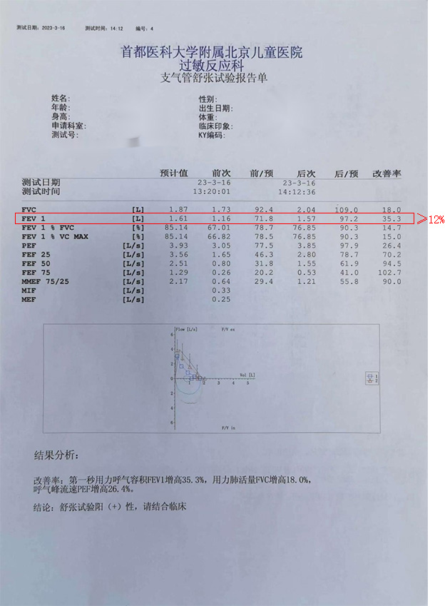 阳性结果,提示存在可逆性气流受限,有助于哮喘诊断,部分临床控制的哮喘患儿可表现为基础肺通气功能正常而支气管舒张试验阳性,提示患儿存在潜在呼吸道痉挛因素和应用支气管舒张剂有益。