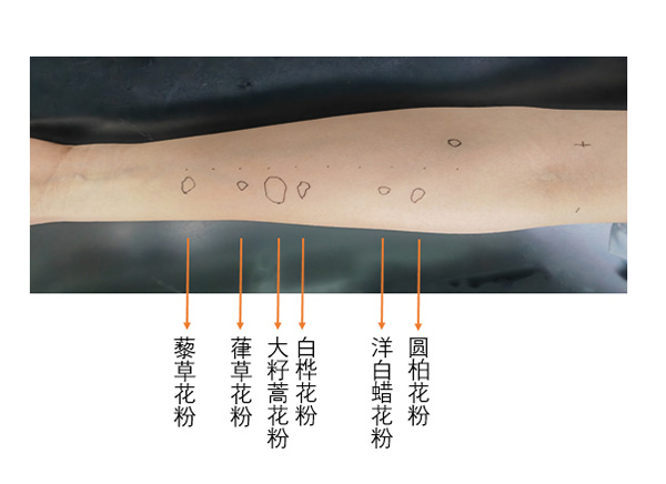 最美人间四月天,万物复苏的季节,但是如果孩子外出游玩时出现鼻痒、喷嚏、流涕和鼻塞的症状,有时还伴随眼睛发红、发痒和流泪的表现,那非常可能春季花粉过敏了。当孩子来过敏反应科进行过敏原检查时,很多都检测出花粉过敏。如下图所示皮肤点刺试验显示多种花粉过敏。