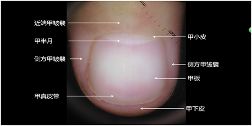 答:上图是组成甲单元的结构名称,其中最重要的部分就是甲半月。甲半月的大小因人而异,和健康无关。甲半月的本质是透过甲板显现出来的远端约1/3至1/2的甲母质。甲母质由具有分化能力的甲母质上皮组成,其可分化形成甲板。宝爸宝妈们可以理解为甲母质是甲板的“妈妈”,甲母质出现了问题,甲板也会出现问题。正常甲母质中是含有黑素细胞的,只不过平时这些黑素细胞处于静止状态,如黑素细胞活性增强或增殖则导致产生黑色素增加,色素颗粒被运输至甲板和甲床,最终甲板上就出现了纵行色带,称为“纵行黑甲”。