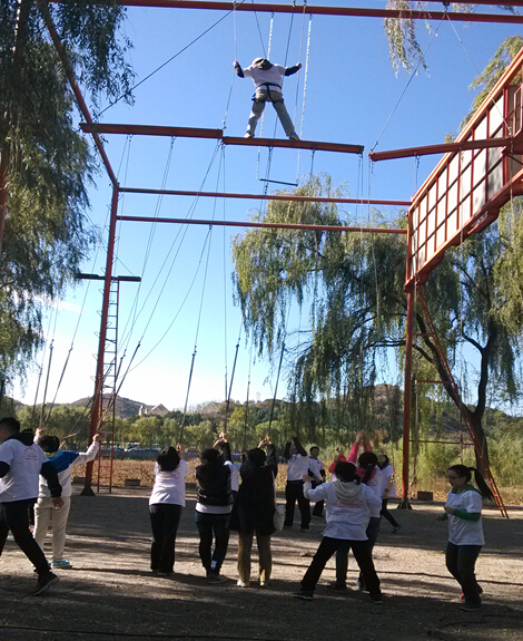 随后大家分组参加了高空项目----“高空挑战”和“合力过桥”。高空挑战是对个人心理的巨大挑战,合力过桥更有团队对个人的支持和鼓励。每位队员爬到8米高的铁架上,“高空挑战”需要通过中间有断板的独木桥;“合力过桥”则是依次通过四块悬吊的木板(木板四角由团队其他成员牵拉固定以配合学员完成),然后由高空降落至地面。这项活动增强了学员适应新环境的能力,培养了个人的自信心,增强了团队的协作能力及集体荣誉感。