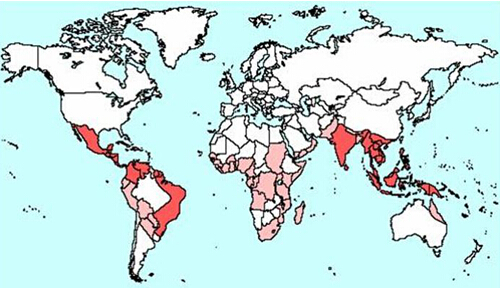 据世界卫生组织(WHO)报道,登革热广泛流行于热带和亚热带的100多个国家和地区(东南亚、西太平洋地区、美洲、地中海东部和非洲等),其中以南美洲、东南亚和西太平洋地区的国家如印度尼西亚、新加坡、泰国、越南、缅甸、印度、不丹、斯里兰卡、马尔代夫、孟加拉等较为严重。