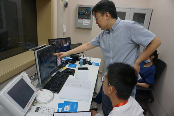 图1 北京儿童医院博士研究生为参与者耐心讲解磁共振相关知识