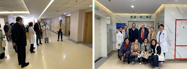 郑胡镛教授首先带领Stuart E. Siegel教授和唐锁勤教授参观了位于顺义院区的血液病、肿瘤病房。看到崭新的病房环境、改善的住院条件、社会心理工作者的积极参与,曾多次来访医院的Siegel教授给予了高度赞扬。并指出青少年儿童肿瘤患者的治疗和管理具有特殊性,与成人有很大区别。Siegel教授参观肿瘤内科病房时,还提出神经母细胞瘤一旦出现脑部受累,治疗难度大、预后差,因此脑部受累的危险因素及如何预防值得进一步研究。