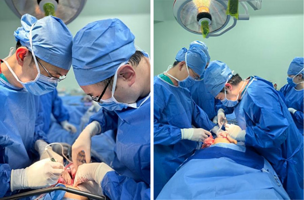 下图:肿瘤外科主治医师韩建宇、胸外科主治医师严冬在术中