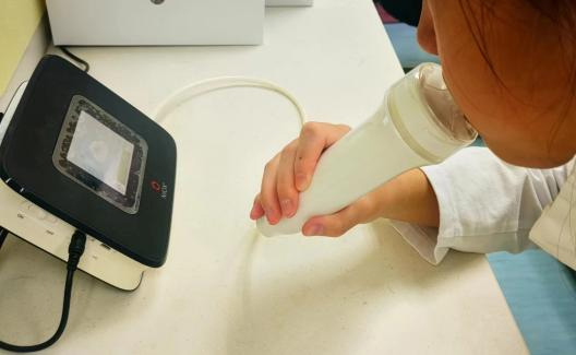呼出气一氧化氮(FeNo)测试是无创的操作,首先先向外吐气,尽力排空肺里面的空气,然后紧紧含住吹嘴用力吸气,直到吸不动为止,最后保证不换气的情况下稍用力一直吹气就可以了。大年龄的孩子吹气10秒钟,低年龄段的孩子吹气6秒钟就可以了。吹气的时候仪器屏幕会有辅助的动画画面告诉你应该用多大的力气吹气是合格的。