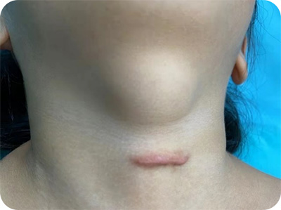 ⑵ 超声引导下甲状舌管囊肿的硬化治疗,是在实时超声引导下,经皮穿刺,将很细的针置入囊腔中,完全抽出囊液后,再注入硬化剂(聚多卡醇),使囊肿壁内的上皮细胞脱水、变性、凝固性坏死,囊壁不再分泌囊液而囊肿闭合、消失。该技术具有微创,方法简便,治疗成本低,并发症少,颈部不遗留瘢痕等优势。小朋友痛苦小,恢复较快,住院时间可缩短至1天。
