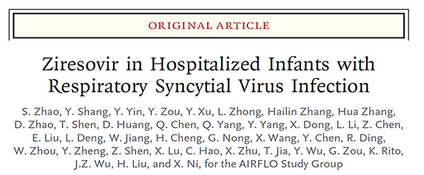 2024年9月26日,国家儿童医学中心 首都医科大学附属北京儿童医院倪鑫教授团队在《新英格兰医学杂志》(The New England Journal of Medicine, NEJM)上在线发表题为“《齐瑞索韦在呼吸道合胞病毒住院婴幼儿中的应用》Ziresovir in Hospitalized Infants with Respiratory Syncytial Virus ”的临床试验结果。该研究结果提示,Ziresovir(齐瑞索韦)安全有效,能够显著降低婴幼儿感染呼吸道合胞病毒(Respiratory Syncytial Virus, RSV)的病毒载量,改善临床症状。这是NEJM发表的首个中国自主研发的儿童创新药临床研究,也是全球首个靶向治RSV感染的Ⅲ期临床试验结果。首都医科大学附属北京儿童医院赵顺英教授为文章第一作者,倪鑫教授为第一通讯作者,四川大学华西医学院附属第二医院刘瀚旻教授和爱科百发邬征博士为共同通讯作者。