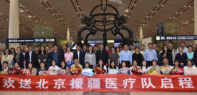 2025年5月20日清晨,北京儿童医院心脏超声科主任医师张红菊随北京市第十一批第三期援疆医疗队奔赴新疆和田,对口支援和田县人民医院,开展为期一年的医疗援助工作。北京市卫生健康委员会党委委员、副主任王建辉等领导前往送行。院党委专职副书记张海鸥,心脏学科党支部书记、心脏超声科主任马宁,心脏学科党支部组织委员、心脏超声科副主任张鑫,党委办公室副主任宫小飞、宣传中心工作人员及援疆干部家属等到机场送行。