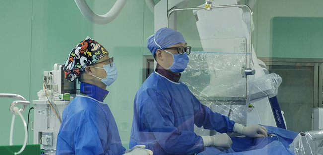次日上午10:00,小丞被推进介入手术室。经验丰富的麻醉医生马阳巍轻声安抚着孩子,同时沉稳地施行麻醉。介入科医生阴捷和吴荣昌凭借精湛技术顺利置管、造影,结果显示左侧颈内动脉向对侧供血良好,右侧颈内动脉C1-C5段闭塞,静脉造影左侧海绵窦显示正常、右侧未显示。为预防海绵窦出血风险,专家们迅速决策,置入弹簧圈对右侧海绵窦进行栓塞,介入手术圆满结束。