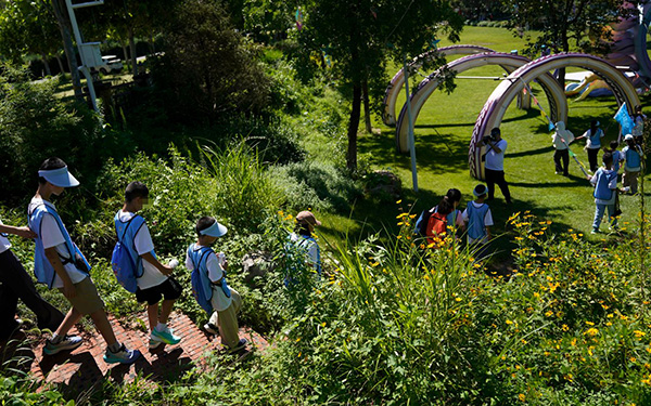 夏令营户外活动中,一个孩子血糖低了,赶紧坐下来吃饼干、喝果汁。新京报记者 薛珺 摄