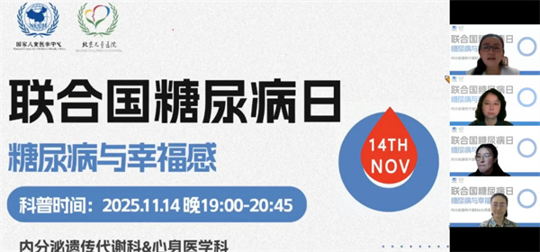 11月14日是联合国糖尿病日,北京儿童医院内分泌遗传代谢科心身医学科以“糖尿病与幸福感”为主题,联合举办了一场精彩的线上科普直播,助力家长解锁科学控糖与守护孩子幸福童年的双重密码,吸引了众多患儿家庭、儿科医护人员及教育工作者参与,医院平台播放量1.2万人次。