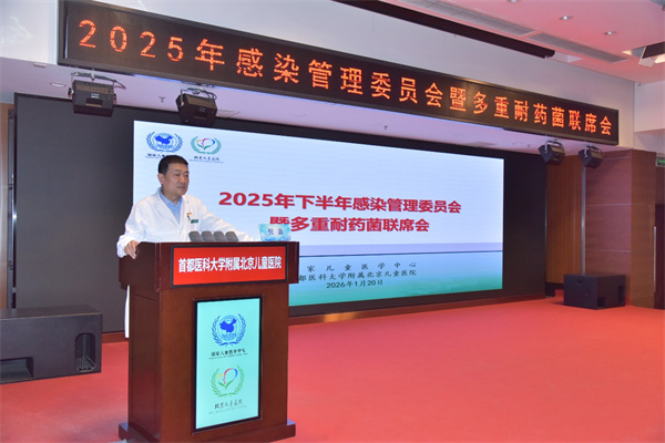 为持续深化医院感染防控体系建设,全面提升感染管理质量,2026年1月20日,国家儿童医学中心首都医科大学附属北京儿童医院于门诊楼12层报告厅成功召开“2025年下半年医院感染管理委员会暨多重耐药菌联席会”。院长倪鑫出席会议并致辞,常务副院长赵成松、北京市儿科质控中心委员、医院感染管理委员会全体委员及院感兼职人员百余人共同参会。会议特邀北京天坛医院感染管理处处长张越巍、北京佑安医院感染管理处处长崔璨做专题授课。