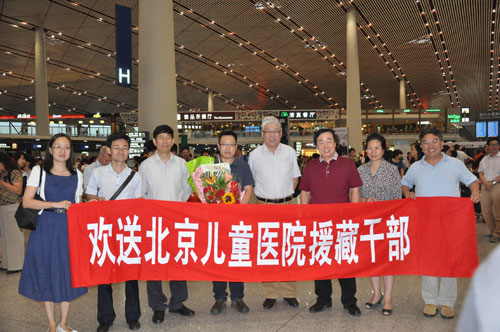 8月19日上午,北京儿童医院呼吸二科主治医师杨海明同志跟随北京市医院管理局“组团式”援藏医疗队赴西藏拉萨市人民医院进行为期一年的医疗援助。北京市卫生计生委党委书记、主任方来英同志,副主任李彦梅同志,市卫计委委员高小俊同志,北京市医管局党委书记、局长封国生同志,党委副书记韦江同志等领导到机场送行,北京儿童医院党委书记、副院长王天有同志前往送行。