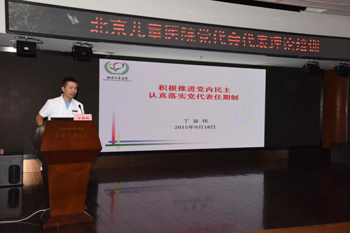 我院党代表大会召开在即。为了让党代表更好地履行职责、提高参政议政能力,2015年9月18日下午,院党委在门诊楼12层报告厅举办党代会代表理论培训班。院党委副书记、纪委书记丁枭伟对前来参会的150余名党代表进行了党代表任期制和党的纪律培训。
