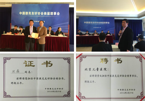 2016年2月29 日,中国捷克友好协会换届理事会在京召开。鉴于与捷克在儿童卫生保健方面开展的良好合作和突出贡献,北京儿童医院成为中捷友好协会理事单位,倪鑫院长当选协会副会长。本次换届共产生四家理事单位,中国—中东欧国家合作事务特别代表、中国驻捷克前大使霍玉珍女士当选新一届中捷友协会长。中国人民对外友好协会副会长宋敬武出席换届理事会活动。