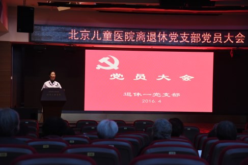 2016年4月21日上午,北京儿童医院离退休党支部党员大会在十二层报告厅召开。医院党委书记王天有、离退休党员等近120人参加会议。会议由老干部处处长吴冬芬主持。
