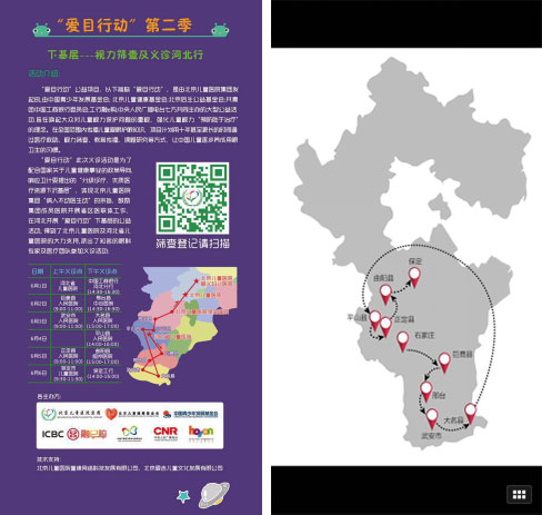 今年“爱目行动”将从6月1日至6月6日,从河北石家庄出发,途径巨鹿县、邢台县、武安市、大名县、平山县、正定县、曲阳县到达保定市,由北京儿童医院及河北省儿童医院的眼科专家组成的义诊团队,为当地的儿童提供视力筛查及义诊服务。同时,对需要进行手术治疗的贫困儿童家庭提供免费救治。