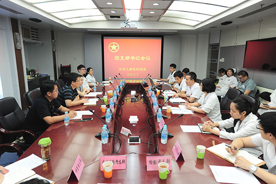 2016年8月5日下午,北京儿童医院团委在门诊楼十二层小会议室召开2016年第二次团支部书记会议。北京儿童医院党委副书记、纪委书记丁枭伟,院团委委员、各团支部书记及志愿服务工作部和血液肿瘤中心相关人员参会。团市委机关工作部部长郑雄、副部长刘扬和市卫生计生委团委书记袁兆龙贯彻落实共青团改革方案,下沉基层到访北京儿童医院,共同参加了此次会议。