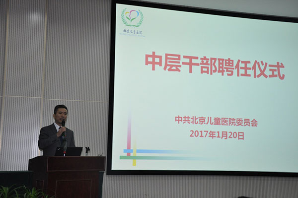 2017年1月20日,北京儿童医院党委举行了中层干部聘任仪式和中层干部集中廉政谈话。党委副书记、纪委副书记丁枭伟同志主持会议。