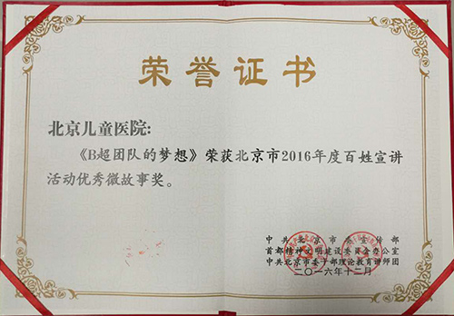 在北京市2016年度百姓宣讲活动中,北京儿童医院推出的《B超团队的梦想》荣获优秀微故事奖,宣传中心卢曦同志被评为“优秀宣讲员”。医院党委坚持用先进典型引领医院文化建设,连续两年获得北京市卫生计生委宣讲工作先进集体。