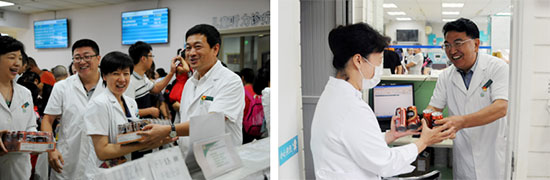 院领导将饮料、八宝粥等慰问品送到医护人员手中,向在高峰期间坚守岗位的职工们表示感谢和慰问,同时叮嘱大家在紧张繁忙的工作同时也要保重身体,共同努力,顺利度过暑期患儿就诊高峰,并激励大家再创佳绩。