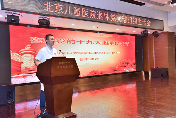 为进一步把离退休党员干部学习习近平总书记系列重要讲话精神引向深入,组织动员离退休党员为党和人民事业增添正能量,以实际行动迎接党的十九大胜利召开,2017年9月20日上午,北京儿童医院在十二层报告厅召开退休党支部组织生活会。院党委副书记、纪委书记丁枭伟,各退休支部书记、支委、退休老党员、老同志等近百人参加会议。会议由离退休党总支书记、老干部处处长吴冬芬主持。