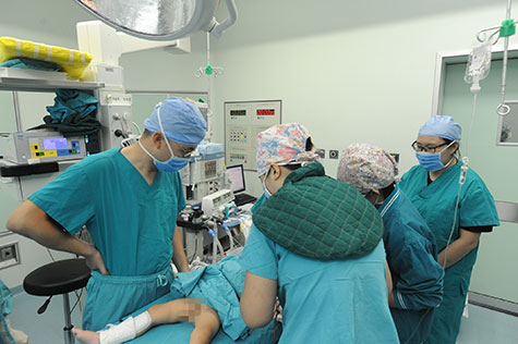 在顺利完成前三台小儿常见疾病门诊手术后,没有半刻休息时间,也没有喝水就坐,紧接着进行第四台手术。看见大家的准备工作就显示出第四台手术的复杂性,整台手术进行了一个小时左右,医务人员始终一刻不停地工作着。