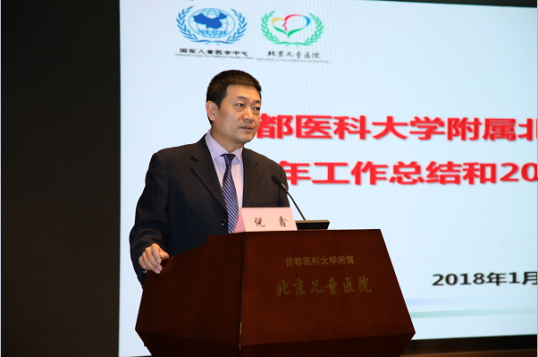 在全体与会人员观看了回顾医院五年成就的《不忘初心 砥砺前行》宣传片后,倪鑫院长首先作北京儿童医院、北京市儿科研究所、北京儿童医院顺义妇儿医院报告以及党委2017年工作总结。2017年,医院获批国家儿童医学中心(北京),顺利实施医药分开综合改革,成功举办了建院75周年系列活动、第三届中国儿科发展国际论坛等重大活动,在医、教、研、防各方面取得了瞩目成绩。在院党委的领导下,全院深入贯彻落实十九大精神,加强党员干部和基层组织等各项建设,落实从严治党主体责任,发挥党委领导核心作用,党建工作取得喜人成绩。最后,倪院长表示全体儿医人携手共进,创造了辉煌的2017。希望大家在2018年为国家儿童医学中心的发展,为使医院立于国内儿科领航地位再接再厉,不断取得新的成绩。