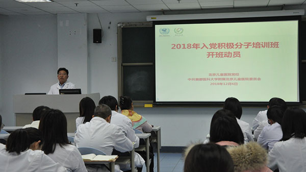2018年12月6日,入党积极分子培训班在北京儿童医院党校胜利召开,党委书记王天有和党委委员、副院长谢向辉出席,全院近90名入党积极分子参加了培训活动。