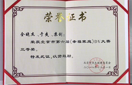 为推进首都“健康北京”建设,2018年7月北京市卫生计生委委托北京市计划生育服务指导中心,举办了第六届北京市《幸福家庭》DV大赛,围绕“幸福家庭、健康生活”主题,发掘身边“大家”和“小家”的幸福事、感动事、典型事,用镜头呈现身边的美好故事,展示幸福生活的深刻内涵。北京儿童医院积极响应,宣传中心向各科室征集作品,北京儿童医院眼科门诊全晓杰、于爽、苏钊创作的《北京儿童医院眼科的幸福生活》DV作品荣获三等奖。