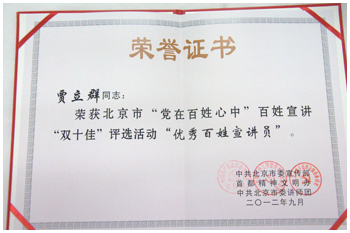 21、2012.09 被市委宣传部、首都精神文明办、北京市委讲师团评为“优秀百姓宣讲员”。