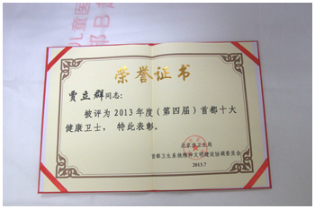 26、2013.07 被卫生局、首都卫生系统文明办授予“第四届首都十大健康卫士”。