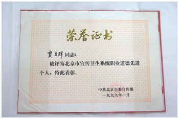 7、1999.01被北京市委宣传部授予“北京市宣传卫生系统职业道德先进个人”。