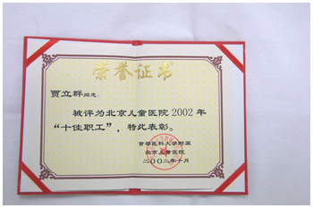 9、2002.10 被北京儿童医院评为“十佳职工”。