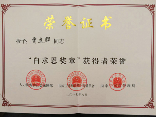 39、2017.08,被人力资源和社会保障部、国家卫生和计划生育委员会和国家医药管理局授予“白求恩奖章”