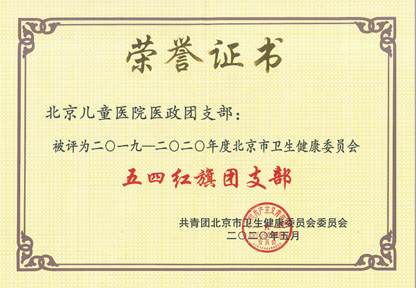 2019年以来,北京儿童医院团委带领全院广大团员青年,在医院党委和市卫生健康委团委、市医管中心团委的领导下,以党的十九大和团十八大精神为指引,坚持党建带团建,推进全面从严治团,开展“青年大学习”等教育实践,在国庆70周年庆祝活动、医耗联动综合改革、新冠肺炎疫情防控工作中听党指挥、冲锋在前、锐意担当、改革创新,为推动首都卫生健康事业科学发展做出了积极贡献,受到市卫生健康委团委嘉奖,获评2019-2020年度北京市卫生健康委员会多项集体和个人荣誉。其中,医政团支部荣获“五四红旗团支部”称号;内科一团支部宣传委员高杨洁荣获“优秀团干部”称号;医政团支部徐玥、神康团支部魏砚琪、急救团支部孙琦、机关团支部任慧敏等4人荣获“优秀团员”称号。